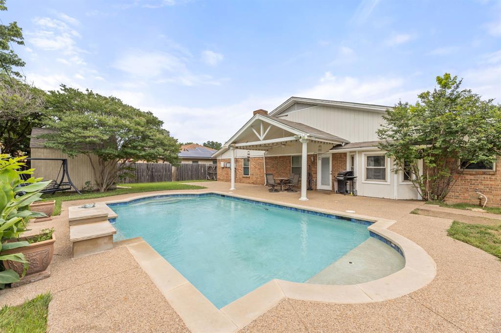Located on a corner lot in a highly desirable neighborhood within Birdville ISD, this home is walking distance to Richland High School and has no HOA. Surrounded by mature trees, it offers a great mix of charm and opportunity. Inside, you’ll find vaulted ceilings in the living and primary bedroom, ceramic tile throughout, and carpet in the bedrooms. The step-saver kitchen features double ovens, double pantries, and beautiful cabinetry. The primary suite includes a walk-in closet and a private ensuite with tile-surround shower. The backyard is built for relaxing or entertaining with a straight-line pool, perfect for volleyball, a large covered patio, extended decking, and French drains. Solar panels, energy-efficient vinyl windows, and a new electrical panel add to the value. Foundation was repaired in 2020 and includes a transferable warranty. There’s even a shed for extra storage. Move right in or bring your vision—this one has endless potential.