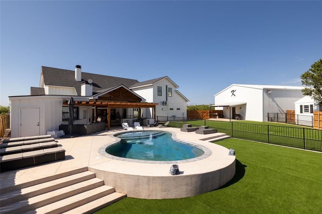 One of a kind Luxury Estate on 13 acres just outside of Abilene. This stunning property is truly unlike anything else offering an incredible combination of comfort, elegance & recreation. Inside the main home you will find a gorgeous, open floor plan perfect for entertaining. The chef's kitchen features quartz countertops, large island, SS appliances with double oven, cook top & a custom brick archway that makes the space unforgettable. A spacious walk-in pantry offers storage beyond compare. The kitchen flows seamlessly into the living area complete with a brick fireplace, built-in bookshelves & a wall of windows overlooking the outdoor oasis. The primary suite is a true retreat boasting a vaulted ceiling, spa like bath with soaking tub, large tile shower, dual quartz vanities & his and hers walk-in closets with amazing space. Two additional bedrooms each offers their own ensuite bath & walk-in closet. Also a well designed mud room, half bath, large laundry room & even a custom dog wash in the garage! Upstairs a versatile bonus or media room with Murphy bed for a great flex space. The guest quarters offer approximately 1000 sq ft. of additional living space with a kitchen, full bath, large great room & loft area for storage or additional sleeping space. You'll also enjoy a 600 sq. ft. gym with loft storage & spacious shop with room for cars, RVs, ATVs or even a boat! Complete with roll up & garage doors. The backyard is an entertainers paradise with a heated in-ground pool, pool house with pop-up TV, outdoor kitchen, large covered patio, heated & cooled playhouse, putting green & a sport court for basketball, tennis or pickleball! 13 beautiful acres with a pond & private running trail, this property offers breathtaking views & endless activities for every member of the family! Just 1 mile outside the city limits, 3 miles from Wylie Schools & 5 miles from Hendrick Hospital. This extraordinary Estate has luxury living, resort-style amenities & unmatched convenience!