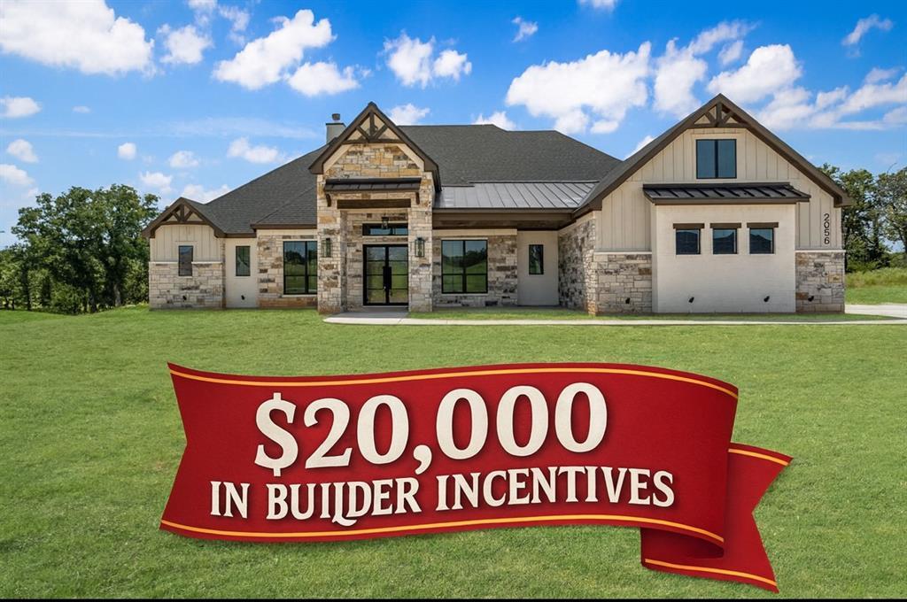 BUYERS TAKE ADVANTAGE OF a $20,000 BUILDER INCENTIVE! Waterfront Luxury in Weatherford's Prestigious Estancia! Welcome to this breathtaking waterfront home. Situated on a beautifully treed, landscaped and sprinklered acre, This turnkey showpiece offers a rare combination of elegance, comfort & modern luxury all with stunning water views & a serene cul de saq location. Step through grand wrought iron double doors into an open, light filled layout featuring soaring ceilings, rich trimwork, and elegant throughout. The expansive living room is anchored by a striking stone fireplace, custom built-ins and a wall of windows that frame the scenic backyard & fill the space with natural light. Designed for everyday living & entertaining the chef's kitchen boasts quartz countertops, custom cabinetry, KitchenAid appliances, a gas cooktop, double ovens and an oversized island with breakfast bar seating- perfect for hosting gatherings. The private primary suite offers a spa like retreat with a massive walk in shower, luxurious finishes and an oversized custom closet. Secondary bedrooms are split for added privacy, Stately home office with french doors, Energy efficiency was top of mind in construction, with spray foam insulation throughout. Step outside to a large covered patio where you can relax and enjoy peaceful water views, quiet evenings and spectacular Parker County sunsets. All this just minutes from Weatherford's dining, shopping & schools. This home is the total package!