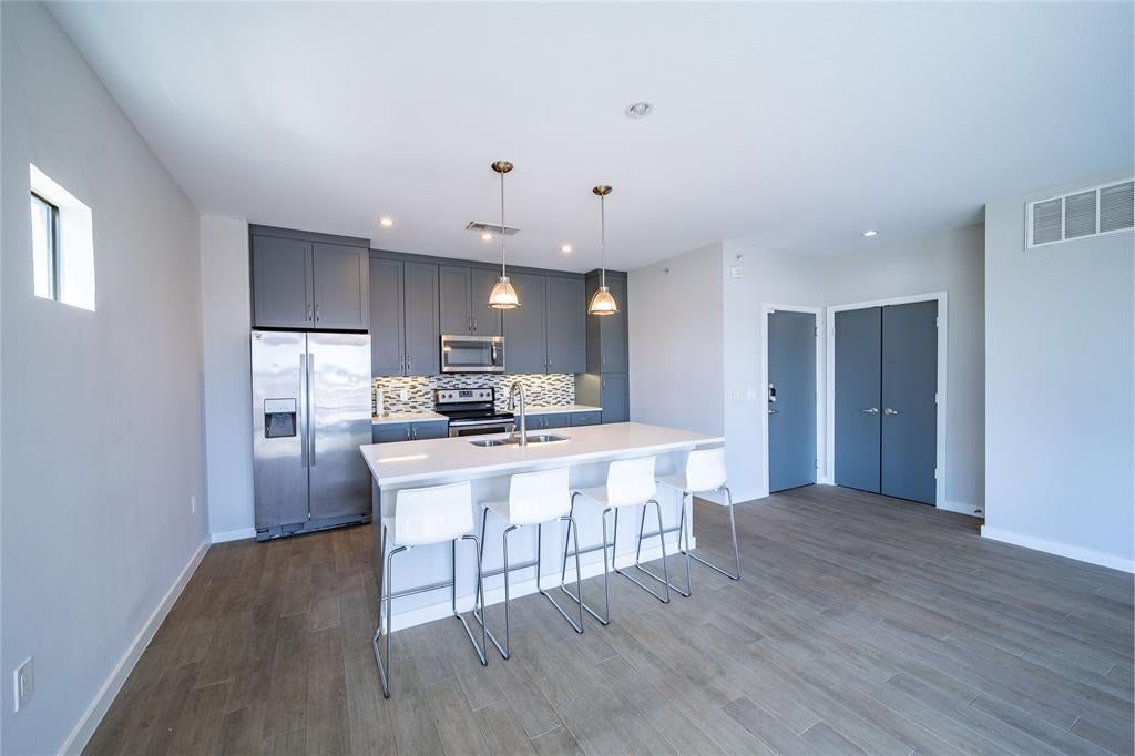 Welcome to this prime top-floor corner residence at The Shelby, ideally located near SMU’s East Campus! Offering the largest floor plan in the building, this home features a bright generous sized open living room and kitchen that maximizes usable space with expansive window views to the Southwest. The split layout places both bedrooms located on one side of the home and the main living areas on the other, creating a balance of privacy and personal time. The primary suite features a Juliette balcony, dual sink vanity, a large walk-in closet and a second closet in the bedroom for ample storage. The second bedroom also enjoys its own Juliette balcony and easy access to the adjacent second full bathroom. At the end of the day, unwind on the covered south-facing balcony and take in stunning sunsets. Conveniently located .4 miles from Mockingbird station, The George W. Bush Presidential Center, and adjacent to the SMU campus, you will find yourself at the heart of it all. Residents enjoy 2 reserved garage parking spaces along with access to an onsite fitness center, a spacious outdoor patio with grills and an indoor inviting lounge for entertaining or socializing. Note: The bedroom and living room photos feature virtual staging.